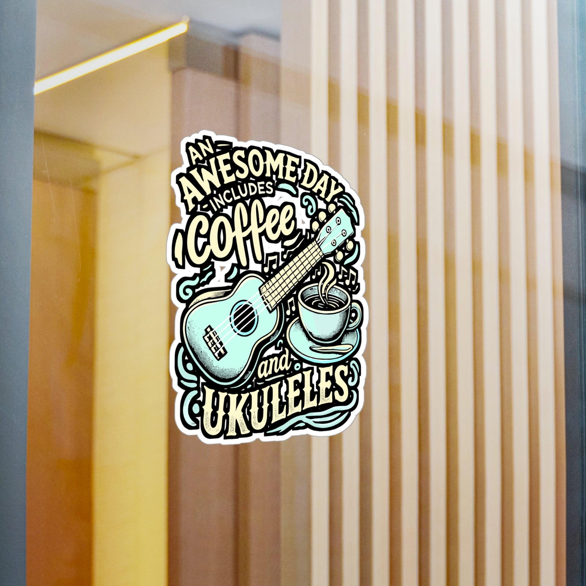 An Awesome Day Includes Coffee And Ukuleles – Vinyl Sticker for Laptop & Water Bottle | Coffee & Ukulele Gift for Musicians
