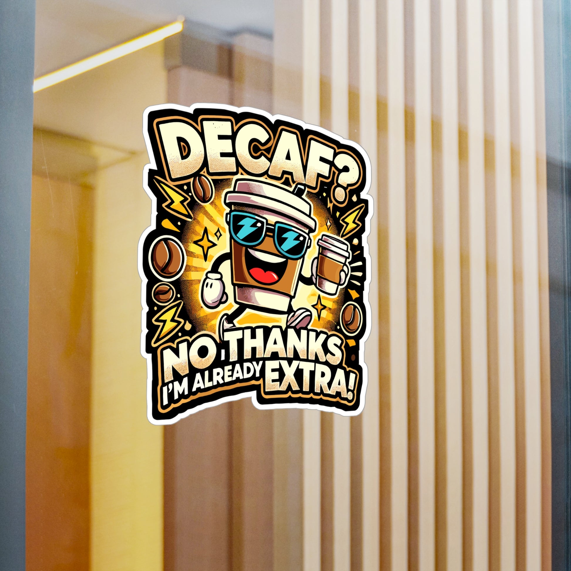 Show off your love for caffeine with this playful design featuring a spirited coffee cup! Perfect for coffee enthusiasts, this Sticker captures the essence of choosing energy over decaf. Wear it with pride and let everyone know you're all about that extra boost!