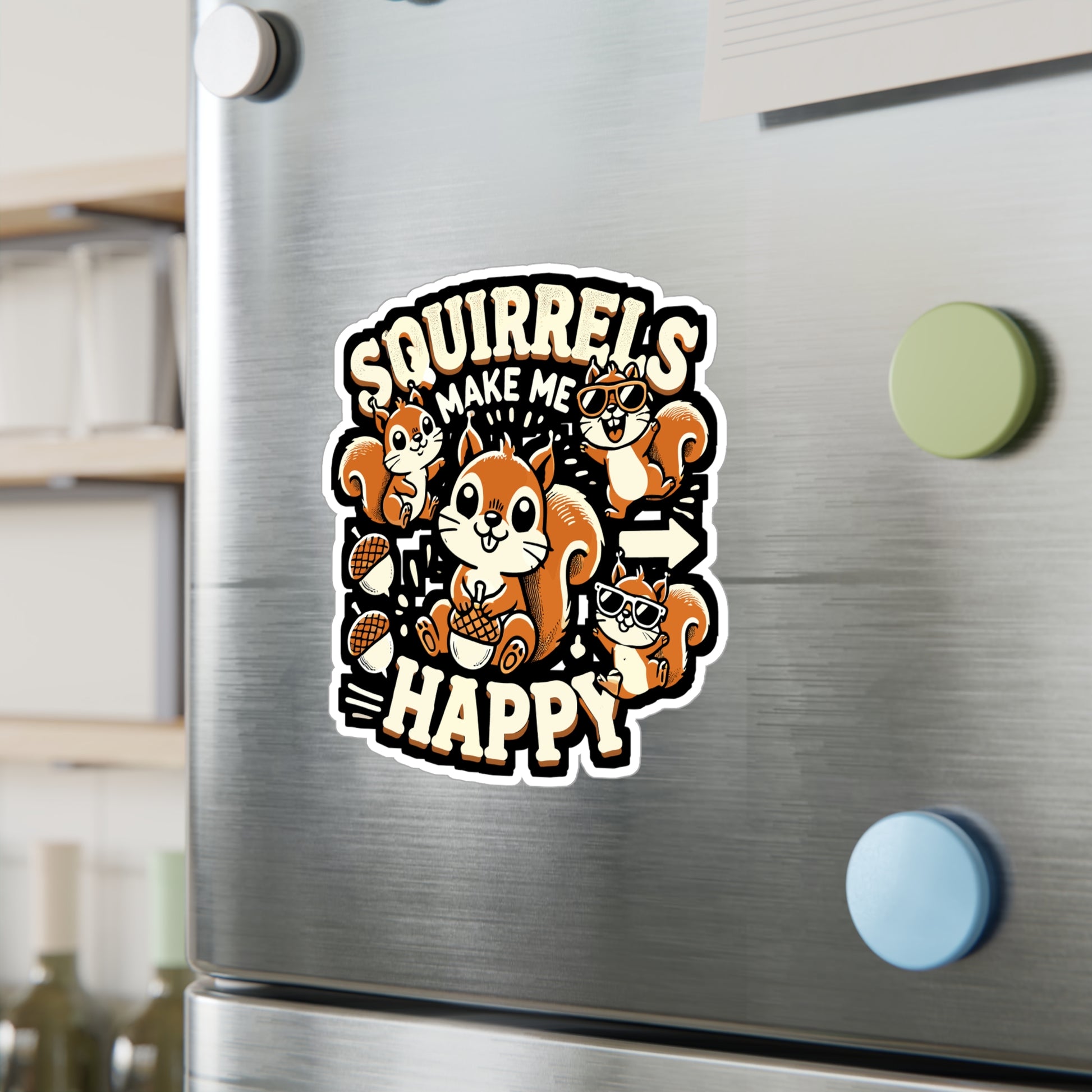 This fun 'Squirrels Make Me Happy' design features adorable squirrels, acorns, and sunglasses, guaranStickerd to bring a smile to any animal lover. Perfect for those who enjoy cute and playful squirrel designs filled with happiness and fun.